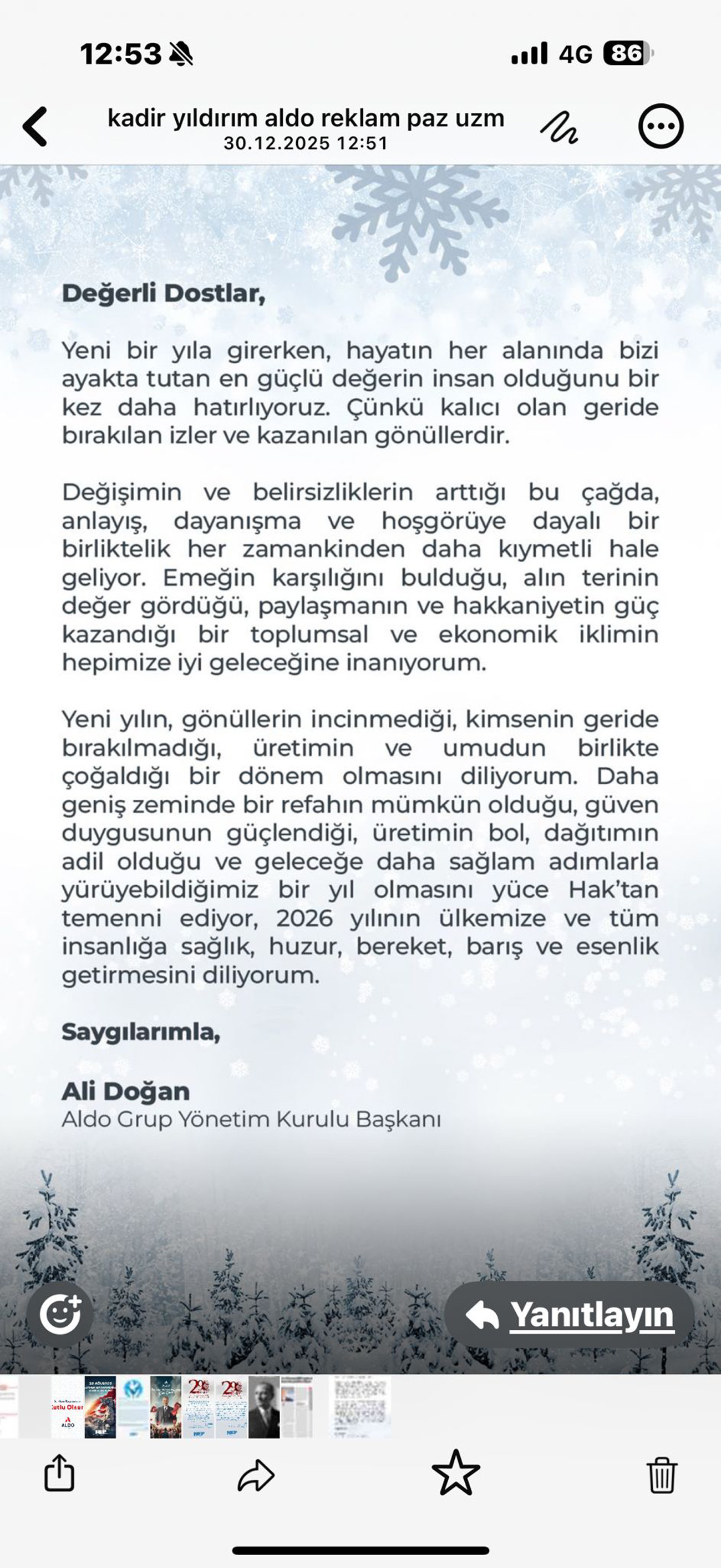 İstikbal Özel Haber/ Fatma Aydın-ALDO GRUP Yönetim Kurulu Başkanı Ali Doğan, “Yeni yılın, gönüllerin incinmediği, kimsenin geride bırakılmadığı, üretimin ve umudun birlikte çoğaldığı bir dönem olmasını diliyorum.” Sözlerini de içeren yeni yılı kutlama mesajı paylaştı.