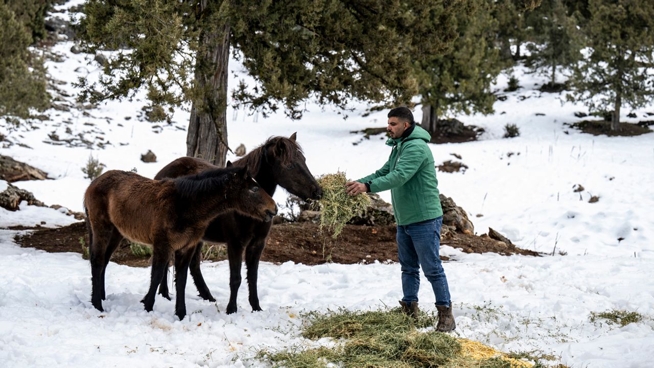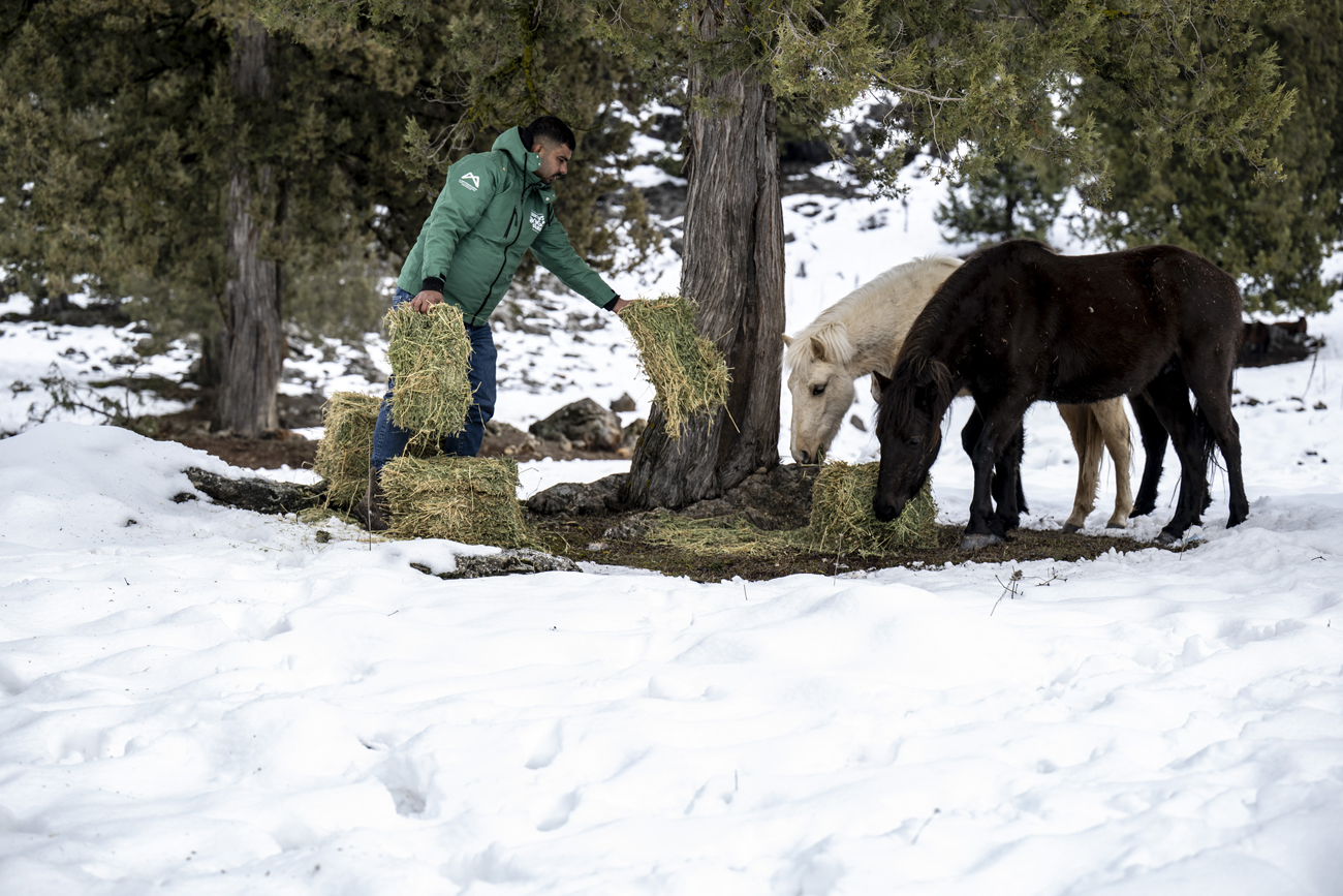 Mersin Büyükşehir Belediyesi Veteriner İşleri Dairesi Başkanlığı bünyesinde faaliyetlerini sürdüren Tarsus Doğa Parkı ekipleri, kış şartlarının ağır geçtiği Tarsus ilçesine bağlı Gülek Mahallesi Karboğazı mevkiinde yaşayan yılkı atlarını besledi.