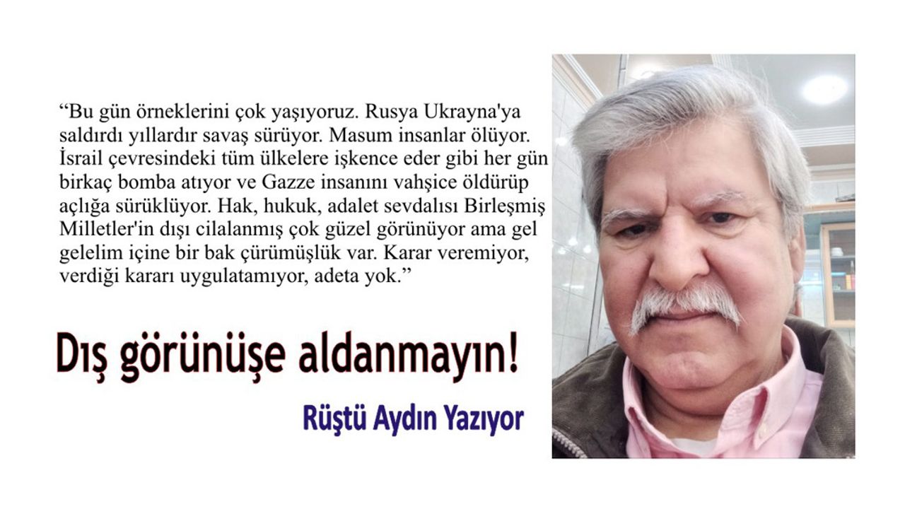 Bugün örneklerini çok yaşıyoruz. Rusya Ukrayna’ya saldırdı yıllardır savaş sürüyor. Masum insanlar ölüyor. İsrail çevresindeki tüm ülkelere işkence eder gibi her gün birkaç bomba atıyor insanları öldürüyor ve Gazze insanını vahşice öldürüp açlığa sürüklüyor. Hak, hukuk, adalet, eşitlik sevdalısı Birleşmiş Milletler’in dışı cilalanmış çok güzel görünüyor ama gel gelelim içine bir bak çürümüşlük var. Karar veremiyor, verdiği kararı uygulatamıyor, adeta yok. Aldanmayalım.