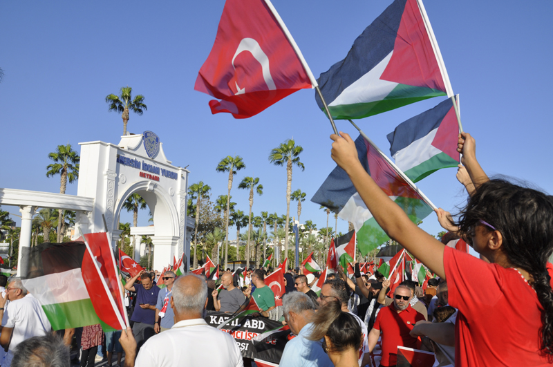 Mersin-Filistin’e Destek Platformu basın açıklamasını Eğitim-Bir Sen ve Eğitime Destek Platformu Mersin İl Başkanı Ertuğrul Yıldız konuşma yaptı. Yıldız konuşmasında “Canı Cehenneme” nakarat deyimi ile İsrail’i ve Tramp’ın barış çabalarını eleştirdi. “Çoluk çocuk kadın demeden okul hastane bombalayanların canı cehenneme!” sözleri üzerine yürüyüşü katılan vatandaşlar “Kahrolsun İsrail “ sloganları atarak konuşmacıya destek verdiler. Gazze’de yaşam için hiç bir şeyin olmadığını söyleyen Başkan Yıldız, “Küresel zalimler bir araya gelmiş, Gazze’de planlı programlı bir soykırım Gerçekleştiriyor” diyen Başkan Yıldız “Katil İsrail” diyerek Netanyahu’nun ABD’den destek aldığını” belirterek zulümlerini, saldırılarını sürdürdüğüne vurgu yaptı.