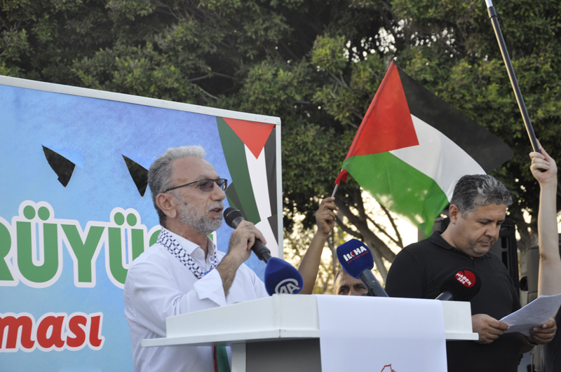 Ardından, Mersin-Filistin’e Destek Platformu ve İlim Yayma Derneği Mersin Şube Başkanı Tahsin Poyraz konuştu. Poyraz, toplantı ve yürüyüşün dünyanın her yerinde eş zamanlı olarak yapıldığını söyledi. Zulümlerin ilk değil sonda olmayacağına vurgu yapan Poyraz “ Bu topraklar tarih soyunca merkez olmuştur. Beklentilerinde saldırılarında ve kurtuluşunda merkezi olmuştur. Farkında olsak ta olmasak ta, istesek te istemesek te sırtımızda ağır bir yük var bir emanetin sahibiyiz.” Diyerek herkesin gücünü küçümsemeden tevdi edilmiş görevleri olduklarının altını çizerek katılımları için herkese teşekkür etti.