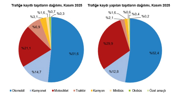 Kasım ayında trafiğe kaydı yapılan taşıtların %52,4'ünü otomobil, %29,9'unu motosiklet, %12,8'ini kamyonet, %2,1'ini traktör, %1,6'sını kamyon, %0,6'sını minibüs, %0,4'ünü otobüs ve %0,2'sini özel amaçlı taşıtlar oluşturdu.