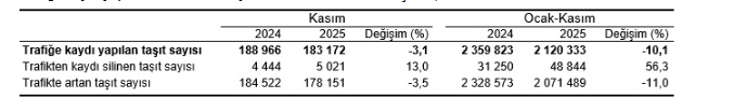 Ocak-Kasım döneminde bir önceki yılın aynı dönemine göre trafiğe kaydı yapılan taşıt sayısı %10,1 azalarak 2 milyon 120 bin 333 adet olurken, trafikten kaydı silinen taşıt sayısı %56,3 artarak 48 bin 844 adet oldu. Böylece Ocak-Kasım döneminde trafikteki toplam taşıt sayısında 2 milyon 71 bin 489 adet artış gerçekleşti.