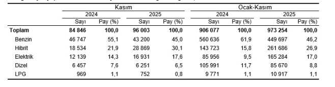 Ocak-Kasım döneminde trafiğe kaydı yapılan 973 bin 254 adet otomobilin %46,2'si benzin, %26,9'u hibrit, %17,0'ı elektrikli, %8,8'i dizel ve %1,1'i LPG yakıtlıdır. Kasım ayı sonu itibarıyla trafiğe kayıtlı 17 milyon 218 bin 442 adet otomobilin ise %32,8'i dizel, %30,8'i benzin, %30,3'ü LPG, %3,8'i hibrit ve %2,0'ı elektriklidir. Yakıt türü bilinmeyen(3) otomobillerin oranı ise %0,2'dir.