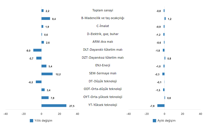 Sanayinin alt sektörleri (2021=100 referans yıllı) incelendiğinde, 2025 yılı Ekim ayında madencilik ve taş ocakçılığı sektörü endeksi bir önceki yılın aynı ayına göre %9,4 arttı, imalat sanayi sektörü endeksi %1,9 arttı ve elektrik, gaz, buhar ve iklimlendirme üretimi ve dağıtımı sektörü endeksi %0,6 arttı.