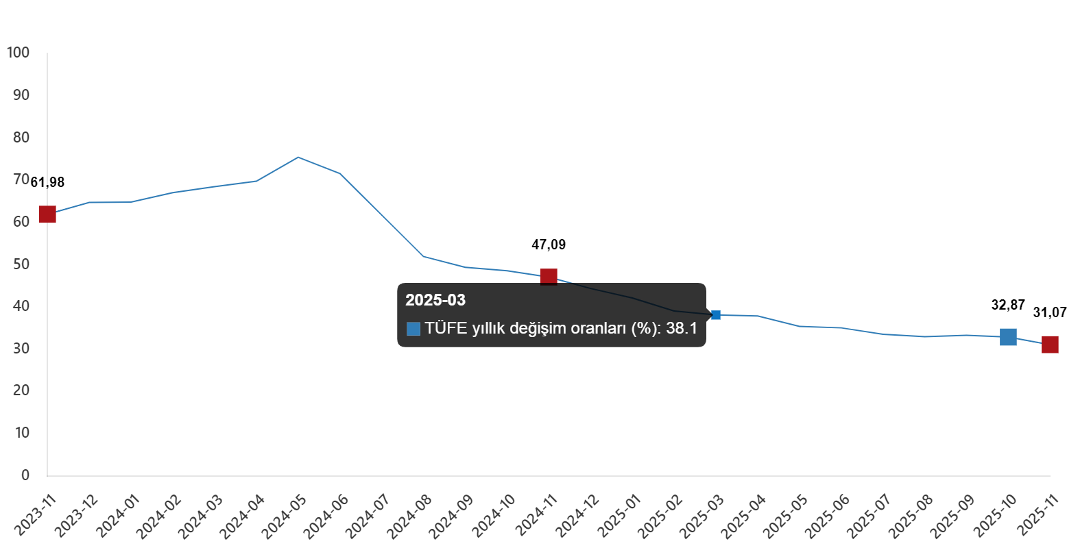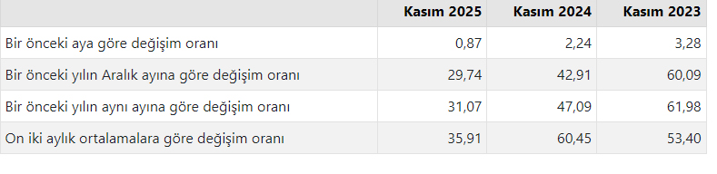 TÜFE'deki (2003=100) değişim 2025 yılı Kasım ayında bir önceki aya göre %0,87 artış, bir önceki yılın Aralık ayına göre %29,74 artış, bir önceki yılın aynı ayına göre %31,07 artış ve on iki aylık ortalamalara göre %35,91 artış olarak gerçekleşti.