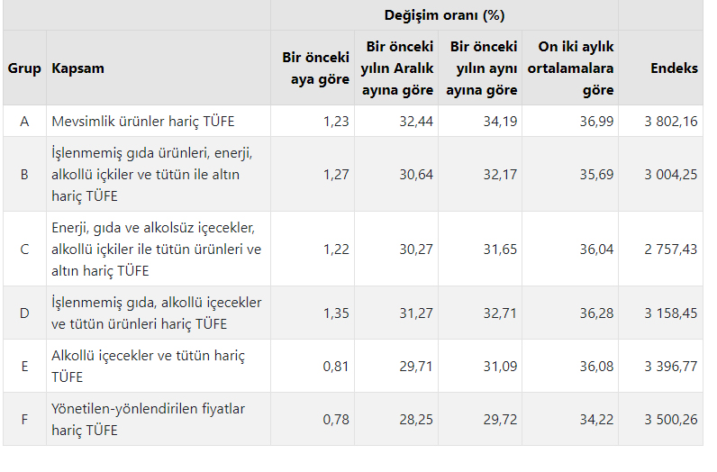 İşlenmemiş gıda ürünleri, enerji, alkollü içkiler ve tütün ile altın hariç TÜFE'deki değişim, 2025 yılı Kasım ayında bir önceki aya göre %1,27 artış, bir önceki yılın Aralık ayına göre %30,64 artış, bir önceki yılın aynı ayına göre %32,17 artış ve on iki aylık ortalamalara göre %35,69 artış olarak gerçekleşti.