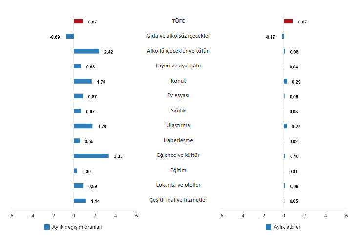 En yüksek ağırlığa sahip 3 ana harcama grubunun aylık değişimleri; gıda ve alkolsüz içeceklerde %0,69 azalış, ulaştırmada %1,78 artış ve konutta %1,70 artış olarak gerçekleşti. İlgili ana grupların aylık değişime olan etkileri ise gıda ve alkolsüz içeceklerde %-0,17, ulaştırmada %0,27 ve konutta %0,29 oldu. (ana harcama gruplarına göre endeksler, ağırlıklar ve değişim oranları Ek Tablo-1'de, ana harcama gruplarının genel endeksteki aylık ve yıllık değişime olan etkileri Ek Tablo-5'tedir).