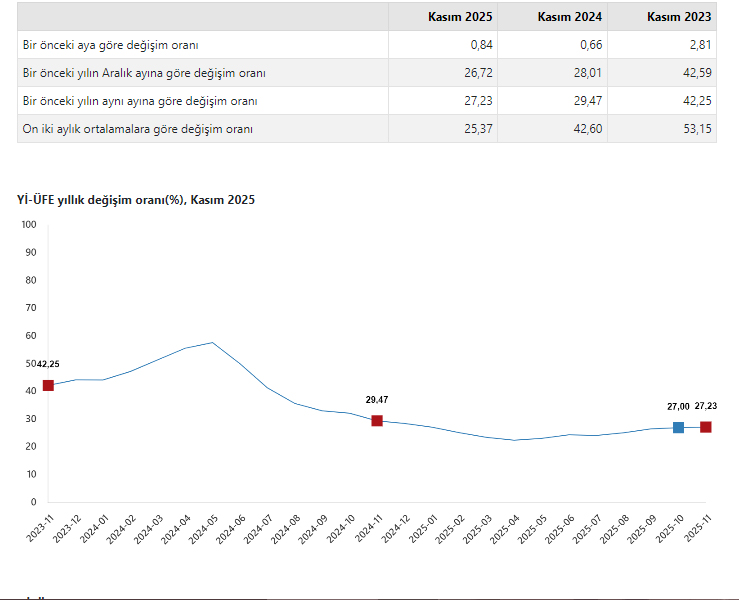 Yİ-ÜFE (2003=100) 2025 yılı Kasım ayında bir önceki aya göre %0,84 artış, bir önceki yılın Aralık ayına göre %26,72 artış, bir önceki yılın aynı ayına göre %27,23 artış ve on iki aylık ortalamalara göre %25,37 artış gösterdi.