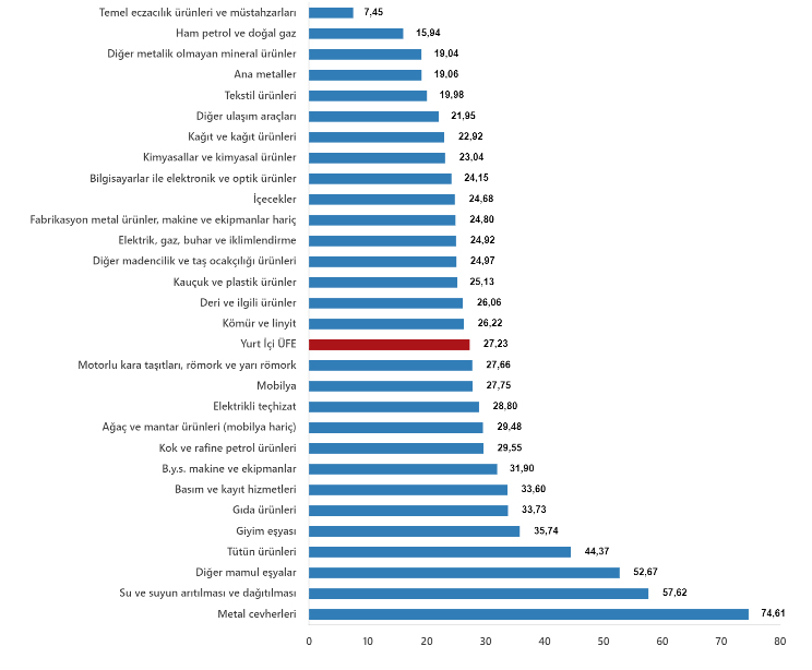 Ana sanayi gruplarının yıllık değişimleri; ara mallarında %23,09 artış, dayanıklı tüketim mallarında %33,17 artış, dayanıksız tüketim mallarında %31,65 artış, enerjide %27,40 artış ve sermaye mallarında %28,44 artış olarak gerçekleşti.
